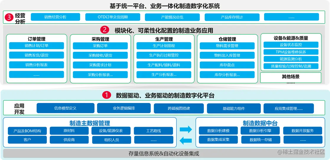 “平台化、一体化”的制造企业数字化系统架构,不同于传统信息化架构“先构建业务、再集成治理”的建设思路,它强调“先构建平台、再迭代业务”,真正实现全流程业务的“数据流不治而顺、业务流双向联动”,系统架构参考图如下: