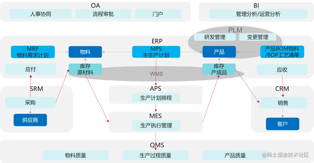 传统信息化架构下,承载生产制造相关业务活动的信息化系统主要是三驾马车: