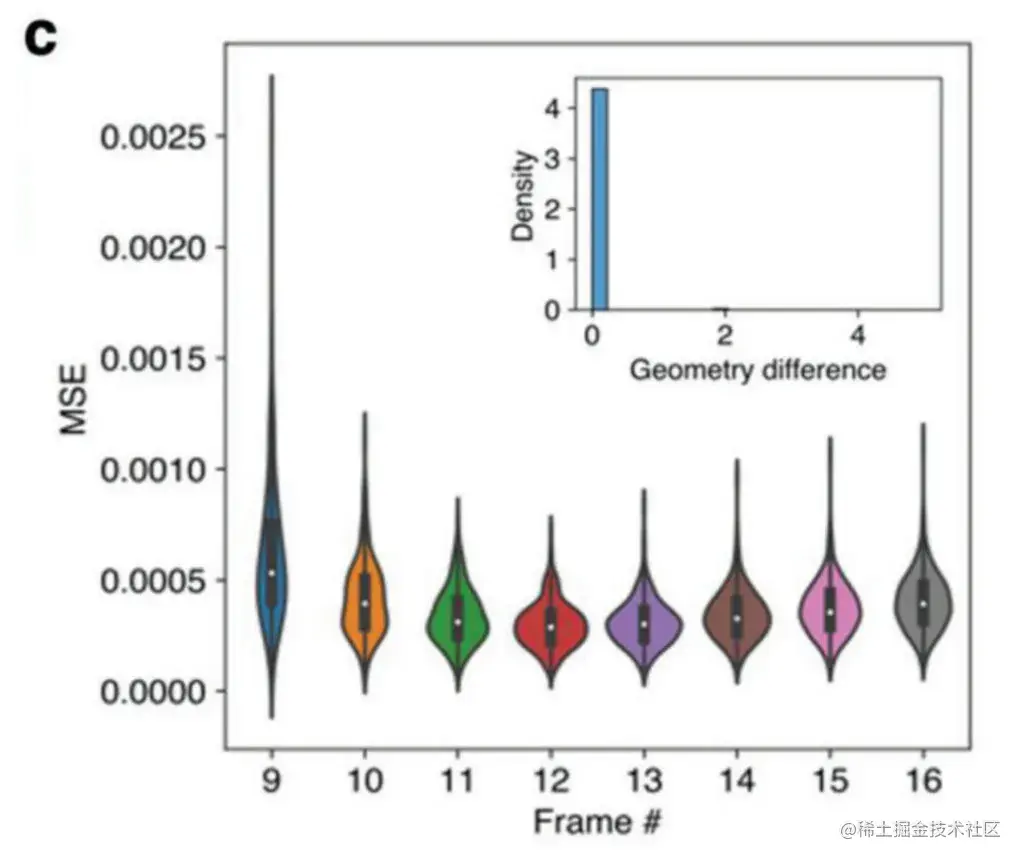 图 4 显示了所有 200 个测试数据的第 9 至第 16 帧的均方误差 (MSE)。每个数据点的 MSE 是通过计算预测的 field maps 和真实值之间像素值平方差的平均值得到的。8 个预测帧的整体 MSE 都很低,全部帧的平均 MSE 都低于 0.001,显示了 ViViT 模型的出色性能。