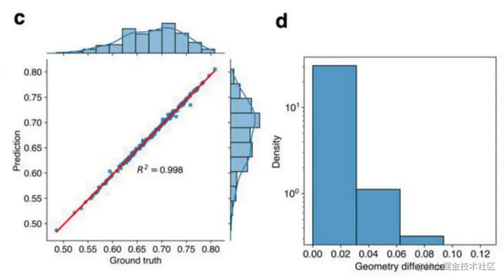 d: CNN 模型进行几何识别的性能。图中显示了 ground truth 与预测结果之间的 geometry difference 分布。