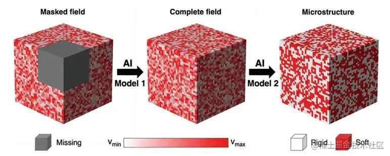 下图展示了该研究的总体示意图。 在左边的图中,灰色立方体为缺失的部分。在 2D 和 3D 情况下,分别有两个 AI 模型组合执行任务。研究人员训练第一个 AI 模型「填补空白」,从 masked field 中恢复 complete field,训练第二个 AI 模型「解谜」,将恢复的 complete field 作为输入,反向获得复合材料对应的微观结构 (Microstructure)。
