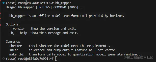容器里边的 /open_explorer 目录,就已经映射到了最开始准备的天工开物工具链的包路径,进入容器后,首先使用 hb_mapper 命令验证环境是否正常,如下: