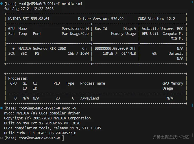 因为后面要训练啥的,所以就默认创建 gpu docker 了,直接执行上述创建 gpu docker 的命令后,就有了名为 oe_infer 的容器了,使用命令 nvidia-smi 和 nvcc -V 验证一下 cuda 环境是否正常,如下: