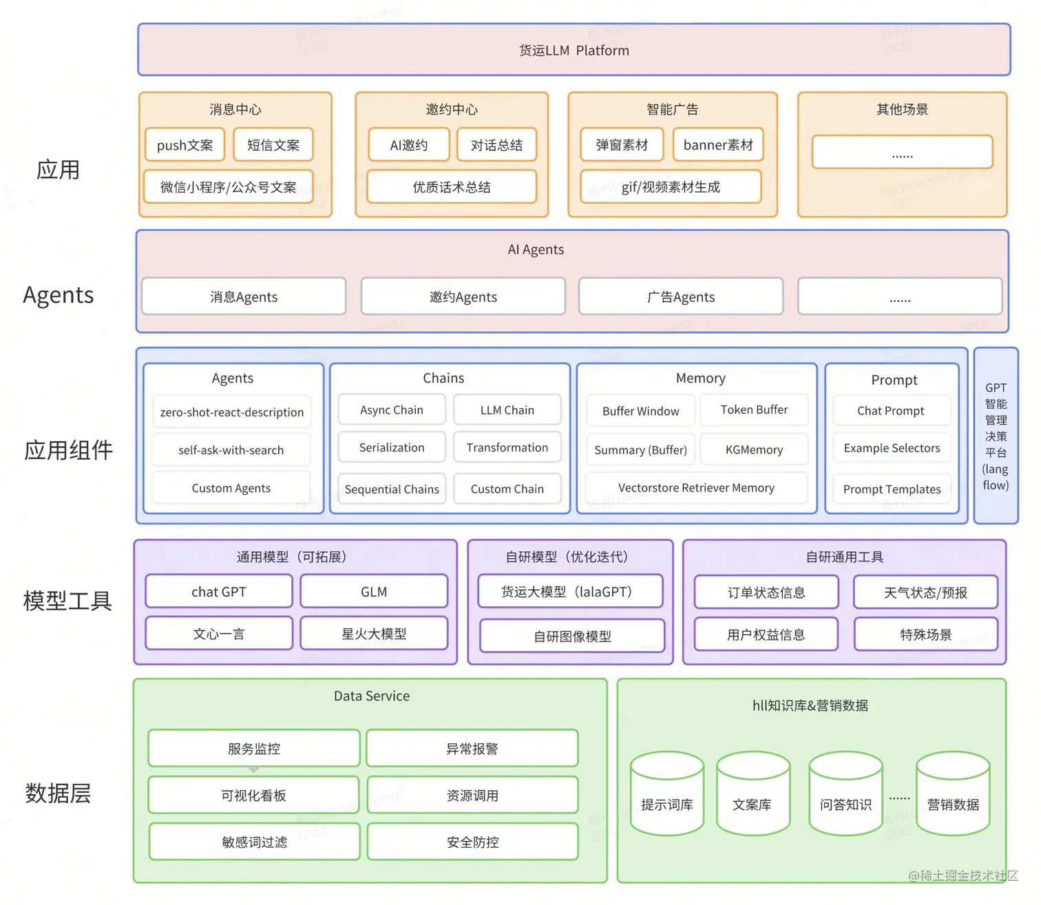 为了解决上述问题,我们设计一个货拉拉大模型营销应用平台,自顶向下分为五个层级,以实现更高效的运行和管理。