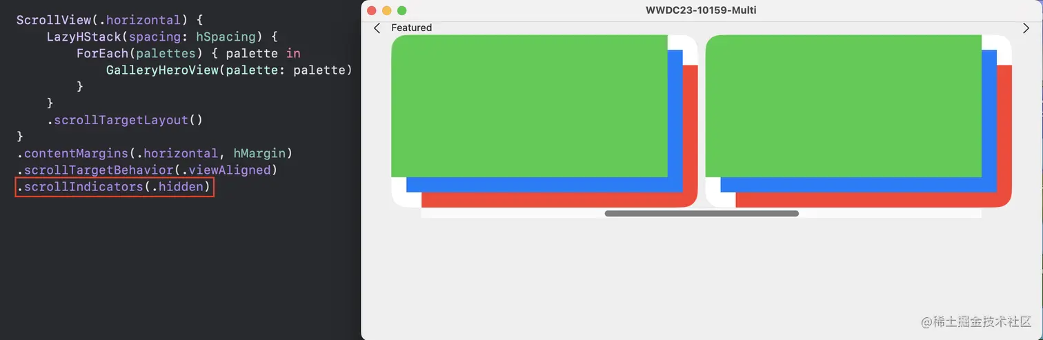在 Mac 上这里的 hidden 可能无效,滚动指示器可能仍然会显示。因为考虑到使用鼠标时,如果没有滚动指示器可能会使滚动变得困难或不可能。所以 scrollIndicators 的默认行为是在使用更灵活的输入设备(如触摸板)时隐藏指示器,但在连接鼠标时允许指示器显示(注意 Apple 妙控鼠标属于灵活设备,试试其他鼠标可能不属于灵活设备)。