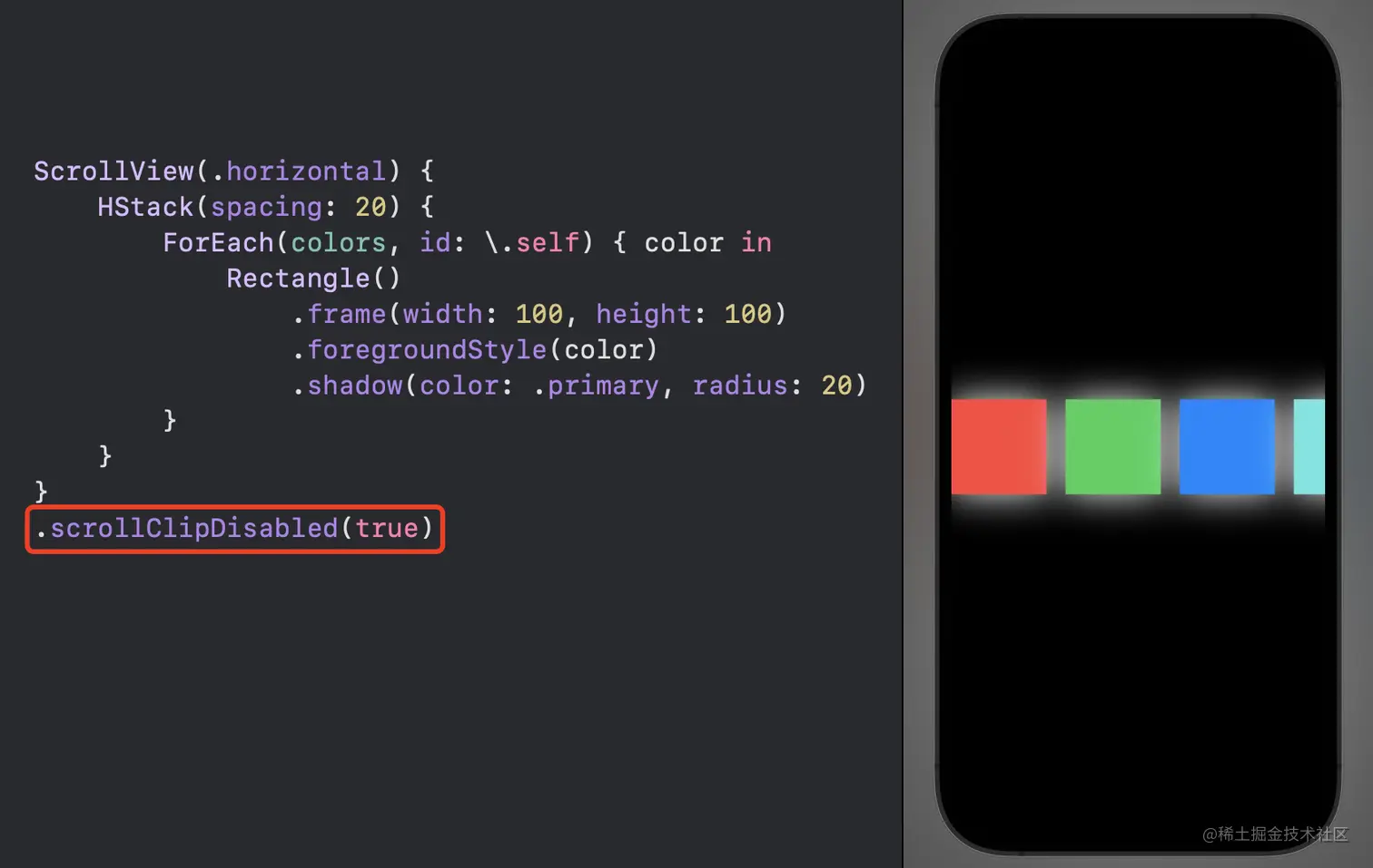 我们可以使用 scrollClipDisabled 修饰符来禁用这种行为,从而避免阴影被裁剪。把参数设置为 true 即可,参数 false 则是上图默认效果。