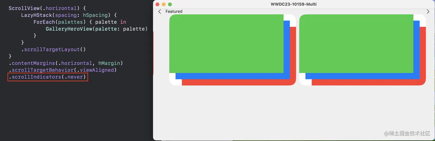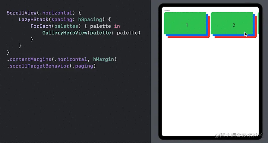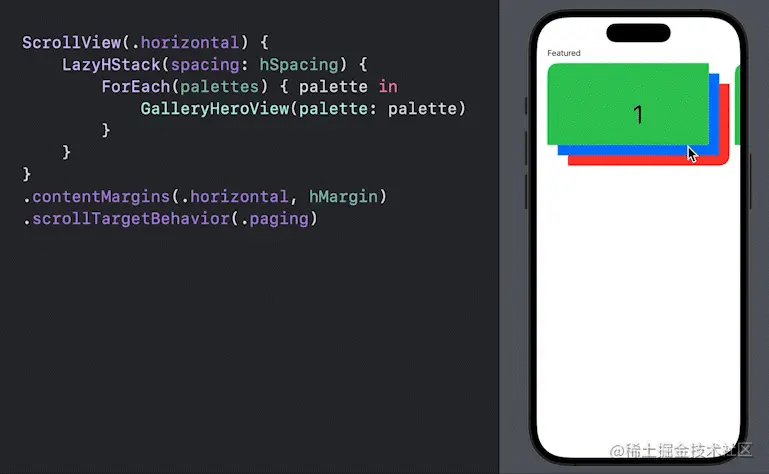 在如下例子中,我们指定对齐行为为 viewAligned ;使用 scrollTargetLayout 让 lazy stack 中的每个 Hero 视图都被视为滚动目标(也可以将单个视图标记为目标)。(当使用 lazy stack 时,使用 scrollTargetLayout 非常重要,即使可见区域之外的视图尚未创建,布局也知道将要创建哪些视图,因此它可以确保 ScrollView 滚动到正确的位置)。