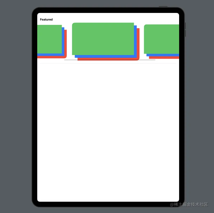 在前面的图中我们有看到,本例的 Hero 视图在 iOS 竖屏上展示一个,而在 iPad 上是展示两个。要实现这一点,以前可能需要使用 GeometryReader 读取 ScrollView 的宽度后计算。而现在,我们可以使用 containerRelativeFrame 修饰符很方便的实现。我们来体验下这个过程吧。