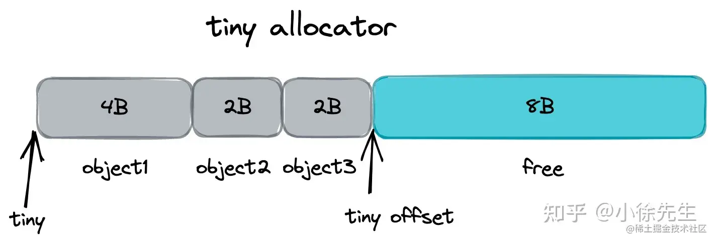 每个 P 独有的 mache 会有个微对象分配器,基于 offset 线性移动的方式对微对象进行分配,每 16B 成块,对象依据其大小,会向上取整为 2 的整数次幂进行空间补齐,然后进入分配流程.