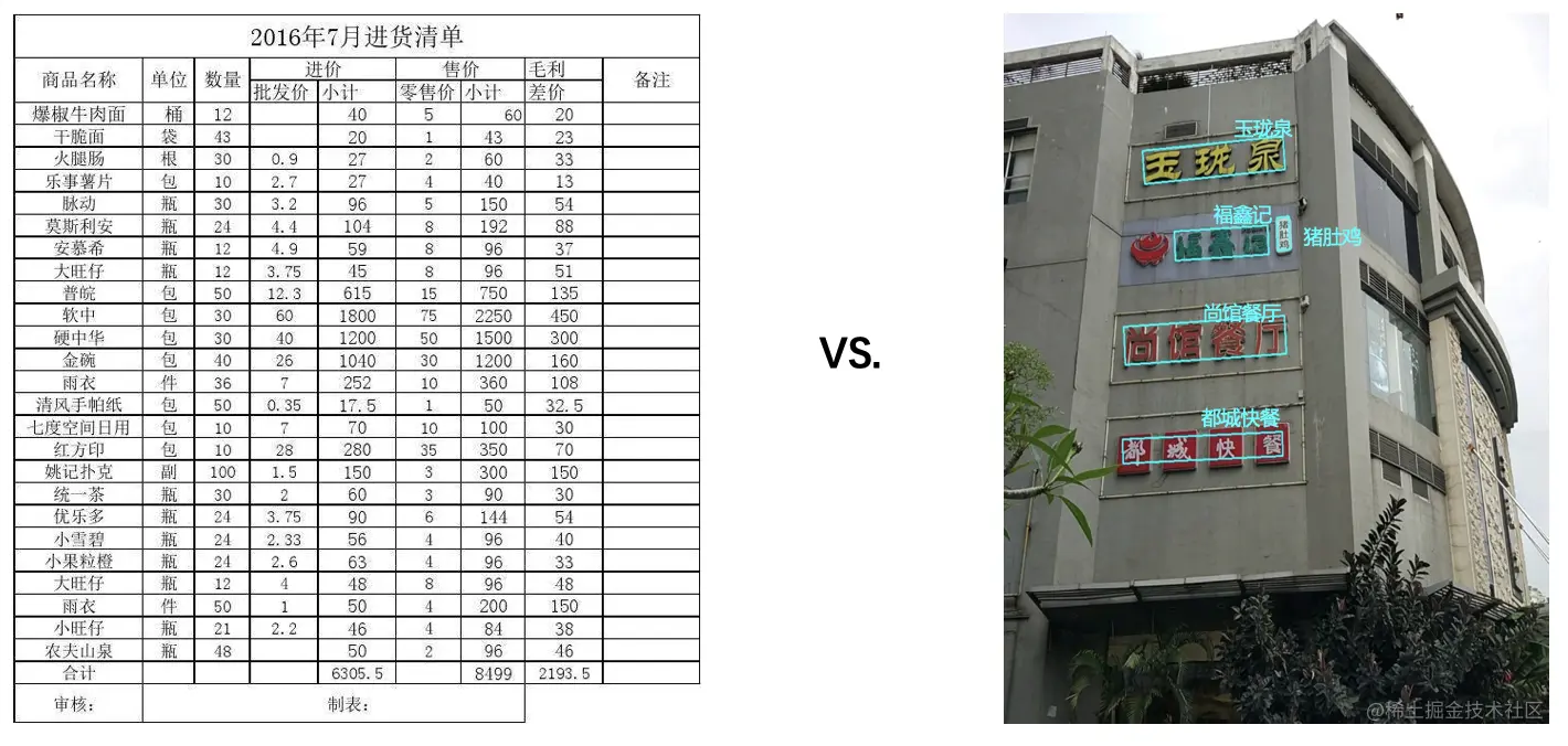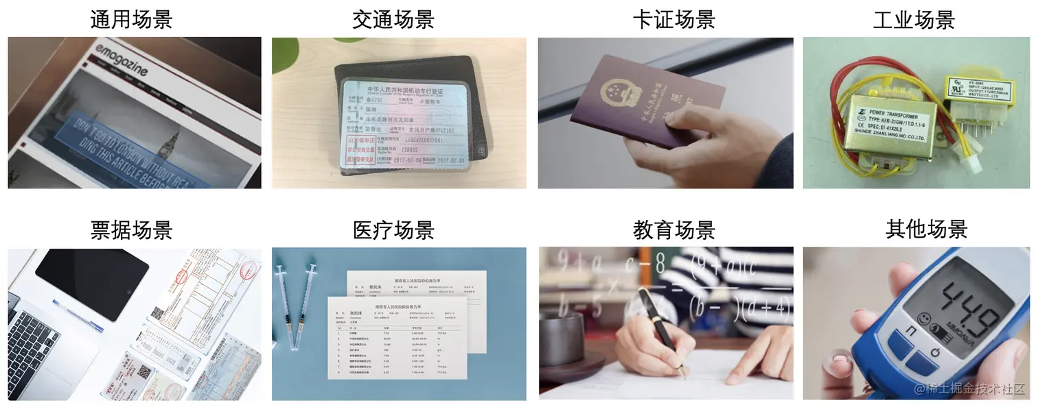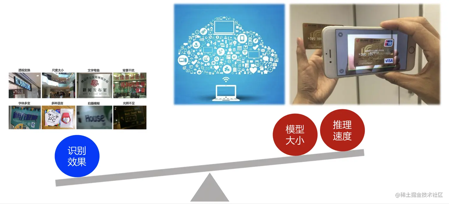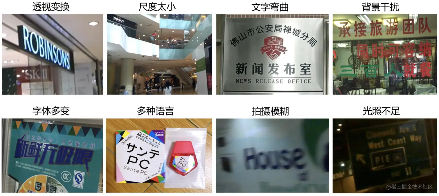 在实际应用中,尤其是在广泛的通用场景下,除了上一节总结的仿射变换、尺度问题、光照不足、拍摄模糊等算法层面的技术难点,OCR技术还面临两大落地难点: