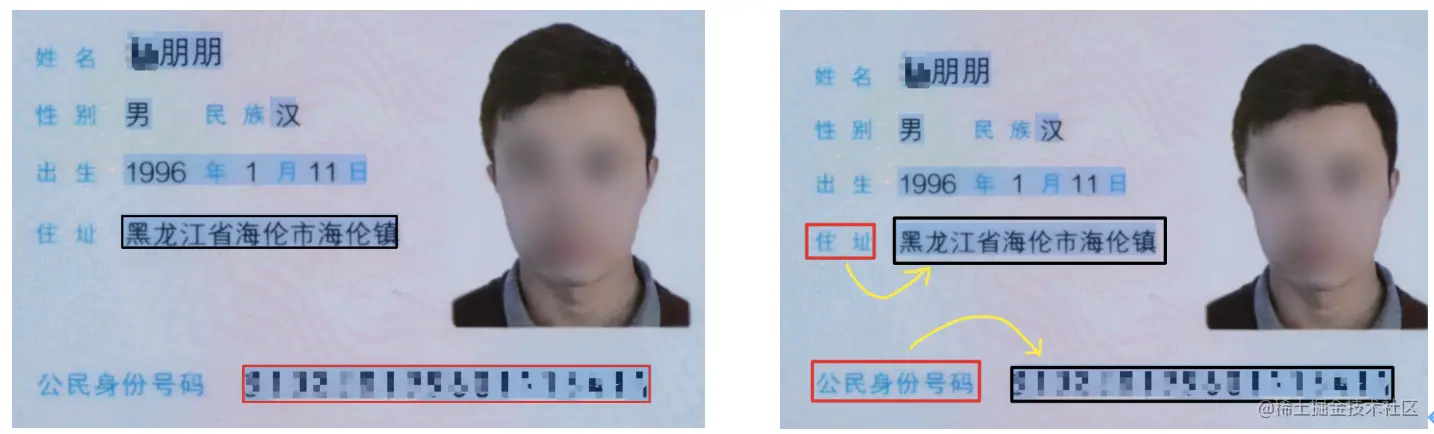 - SER: 语义实体识别 (Semantic Entity Recognition),对每一个检测到的文本进行分类,如将其分为姓名,身份证。如下图中的黑色框和红色框。