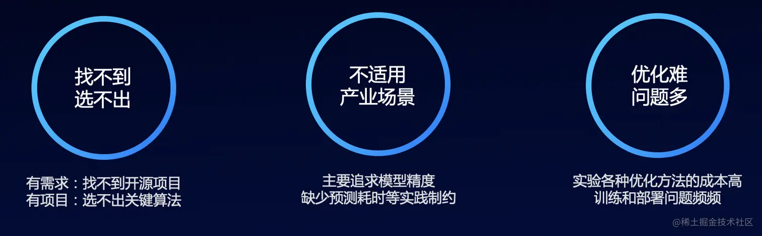 开源社区资源丰富,但是信息不对称导致开发者并不能高效地解决痛点问题。一方面,开源社区资源过于丰富,开发者面对一项需求,无法快速从海量的代码仓库中找到匹配业务需求的项目,即存在“找不到”的问题;另一方面,在算法选型时,英文公开数据集上的指标,无法给开发者常常面对的中文场景提供直接的参考,逐个算法验证需要耗费大量时间和人力,且不能保证选出最合适的算法,即“选不出”。