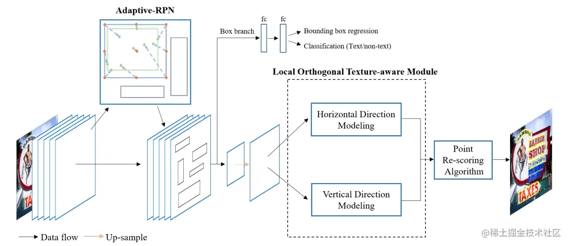Contournet[18]基于提出对文本轮廓点建模获取弯曲文本检测框,该方法首先使用Adaptive-RPN获取文本区域的proposal特征,然后设计了局部正交纹理感知LOTM模块学习水平与竖直方向的纹理特征,并用轮廓点表示,最后,通过同时考虑两个正交方向上的特征响应,利用Point Re-Scoring算法可以有效地滤除强单向或弱正交激活的预测,最终文本轮廓可以用一组高质量的轮廓点表示出来。