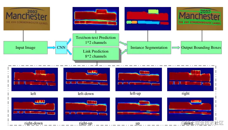 Pixellink[7]采用分割的方法解决文本检测问题,分割对象为文本区域,将同属于一个文本行(单词)中的像素链接在一起来分割文本,直接从分割结果中提取文本边界框,无需位置回归就能达到基于回归的文本检测的效果。但是基于分割的方法存在一个问题,对于位置相近的文本,文本分割区域容易出现“粘连“问题。Wu, Yue等人[8]提出分割文本的同时,学习文本的边界位置,用于更好的区分文本区域。另外Tian等人[9]提出将同一文本的像素映射到映射空间,在映射空间中令统一文本的映射向量距离相近,不同文本的映射向量距离变远。