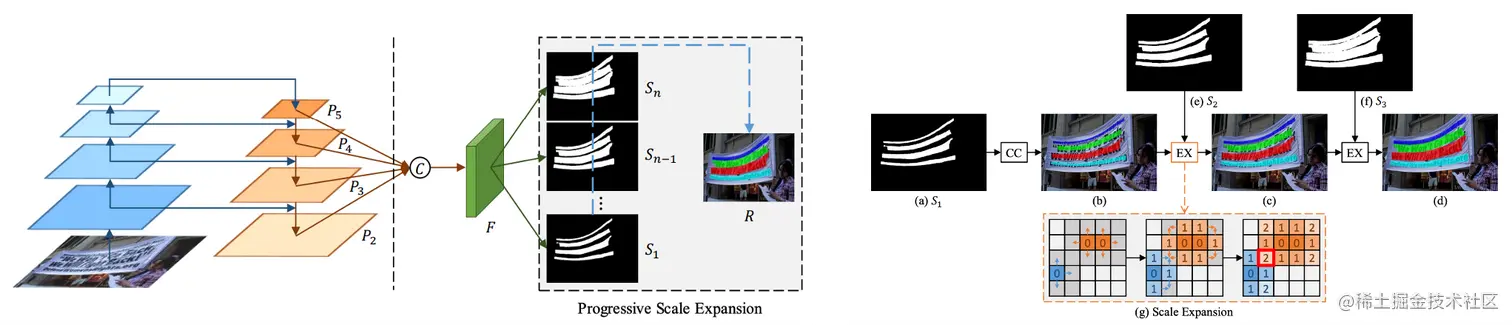 假设用了PSENet后处理用了3个不同尺度的kernel,如上图s1,s2,s3所示。首先,从最小kernel s1开始,计算文本分割区域的连通域,得到(b),然后,对连通域沿着上下左右做尺度扩张,对于扩张区域属于s2但不属于s1的像素,进行归类,遇到冲突点时,采用“先到先得”原则,重复尺度扩张的操作,最终可以得到不同文本行的独立的分割区域。