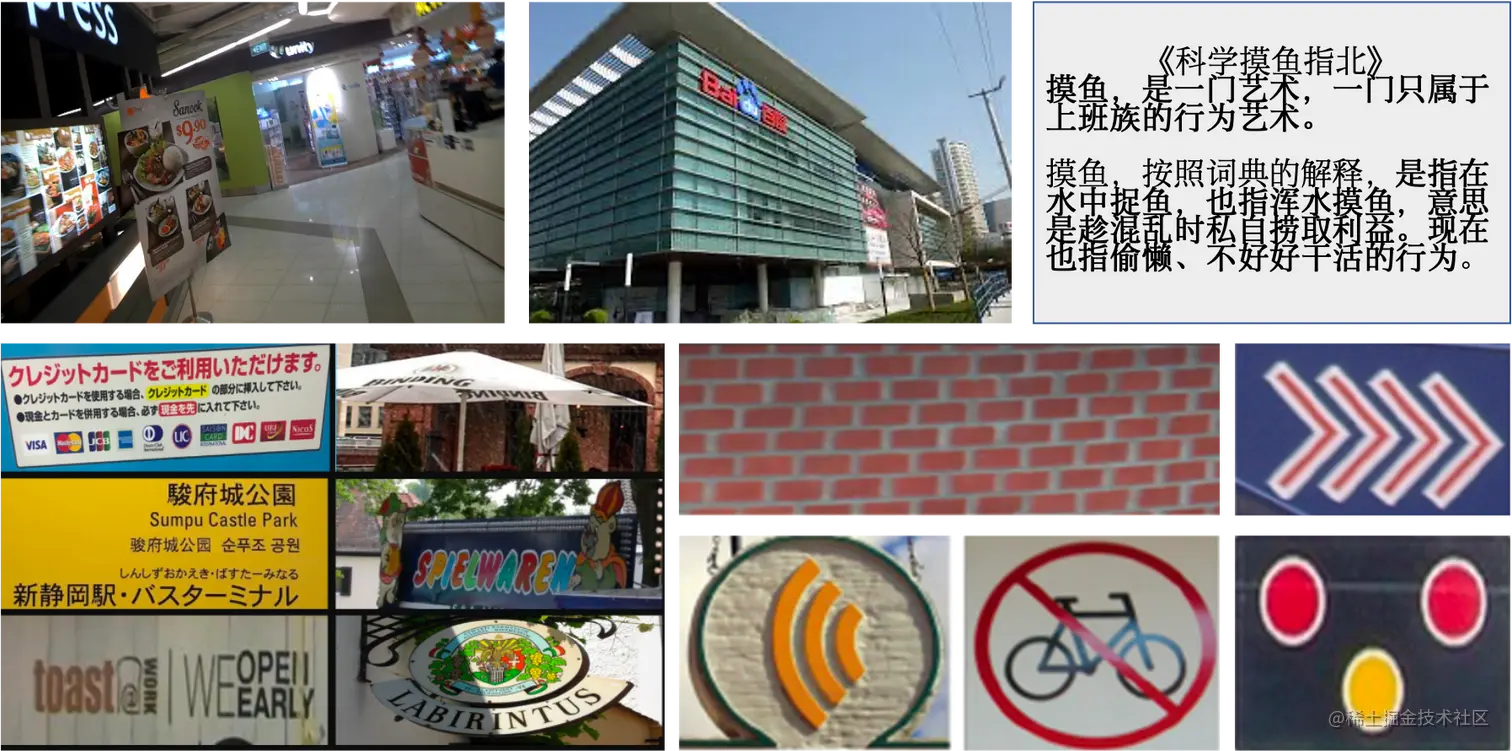 - 自然场景中文本具有多样性:文本检测受到文字颜色、大小、字体、形状、方向、语言、以及文本长度的影响;