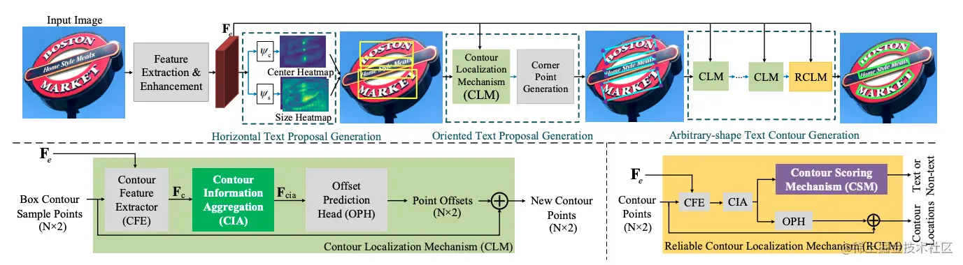 PCR[14]提出渐进式的坐标回归处理弯曲文本检测问题,总体分为三个阶段,首先大致检测到文本区域,获得文本框,另外通过所设计的Contour Localization Mechanism预测文本最小包围框的角点坐标,然后通过叠加多个CLM模块和RCLM模块预测得到弯曲文本。该方法利用文本轮廓信息聚合得到丰富的文本轮廓特征表示,不仅能抑制冗余的噪声点对坐标回归的影响,还能更精确的定位文本区域。