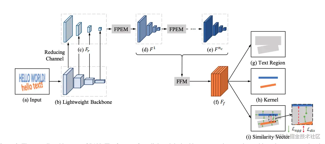 PAN[11]针对文本检测预测速度慢的问题,从网络设计和后处理方面进行改进,提升算法性能。首先,PAN使用了轻量级的ResNet18作为Backbone,另外设计了轻量级的特征增强模块FPEM和特征融合模块FFM增强Backbone提取的特征。在后处理方面,采用像素聚类方法,沿着预测的文本中心(kernel)四周合并与kernel的距离小于阈值d的像素。PAN保证高精度的同时具有更快的预测速度。