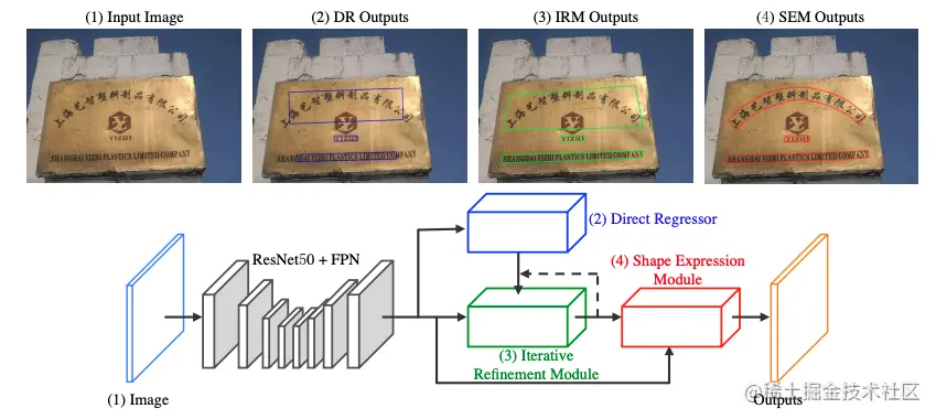 LOMO[19]针对长文本和弯曲文本问题,提出迭代的优化文本定位特征获取更精细的文本定位,该方法包括三个部分,坐标回归模块DR,迭代优化模块IRM以及任意形状表达模块SEM。分别用于生成文本大致区域,迭代优化文本定位特征,预测文本区域、文本中心线以及文本边界。迭代的优化文本特征可以更好的解决长文本定位问题以及获得更精确的文本区域定位。