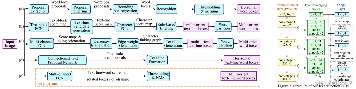 EAST[4]针对倾斜文本的定位问题,提出了two-stage的文本检测方法,包含 FCN特征提取和NMS部分。EAST提出了一种新的文本检测pipline结构,可以端对端训练并且支持检测任意朝向的文本,并且具有结构简单,性能高的特点。FCN支持输出倾斜的矩形框和水平框,可以自由选择输出格式。