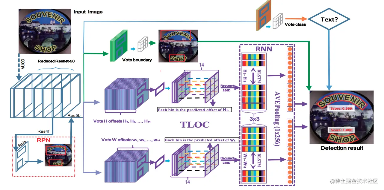 CTPN[3]基于Fast-RCNN算法,扩展RPN模块并且设计了基于CRNN的模块让整个网络从卷积特征中检测到文本序列,二阶段的方法通过ROI Pooling获得了更准确的特征定位。但是TextBoxes和CTPN只支持检测横向文本。