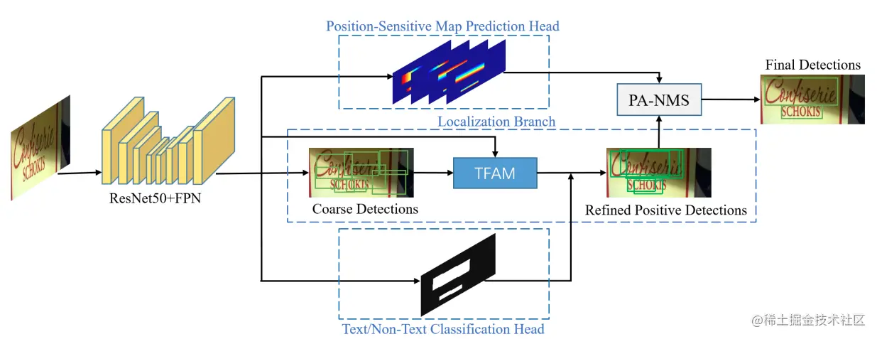 MOST[15]提出TFAM模块动态的调整粗粒度的检测结果的感受野,另外提出PA-NMS根据位置信息合并可靠的检测预测结果。此外,训练中还提出 Instance-wise IoU 损失函数,用于平衡训练,以处理不同尺度的文本实例。该方法可以和EAST方法结合,在检测极端长宽比和不同尺度的文本有更好的检测效果和性能。