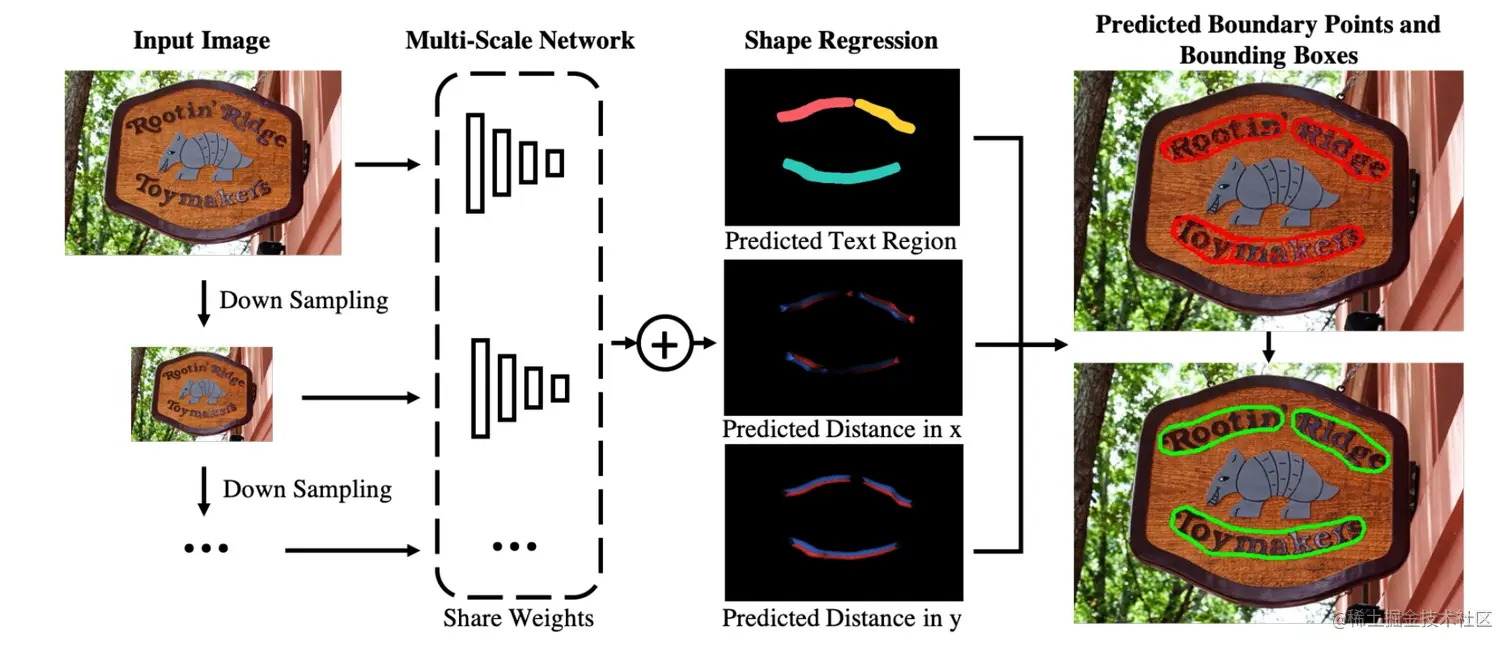 MSR[20]针对文本检测的多尺度问题,提出提取相同图像的多个scale的特征,然后将这些特征融合并上采样到原图尺寸,网络最后预测文本中心区域、文本中心区域每个点到最近的边界点的x坐标偏移和y坐标偏移,最终可以得到文本区域的轮廓坐标集合。