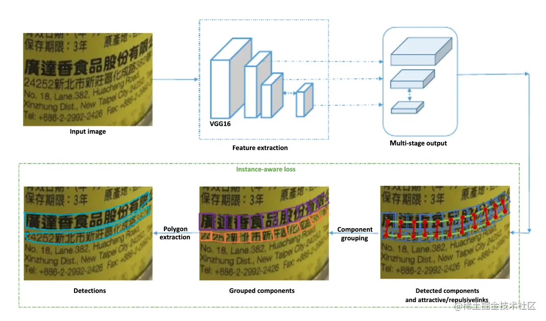 Seglink++[17]针对弯曲文本和密集文本问题,提出了一种文本块单元之间的吸引关系和排斥关系的表征,然后设计了一种最小生成树算法进行单元组合得到最终的文本检测框,并提出instance-aware 损失函数使Seglink++方法可以端对端训练。