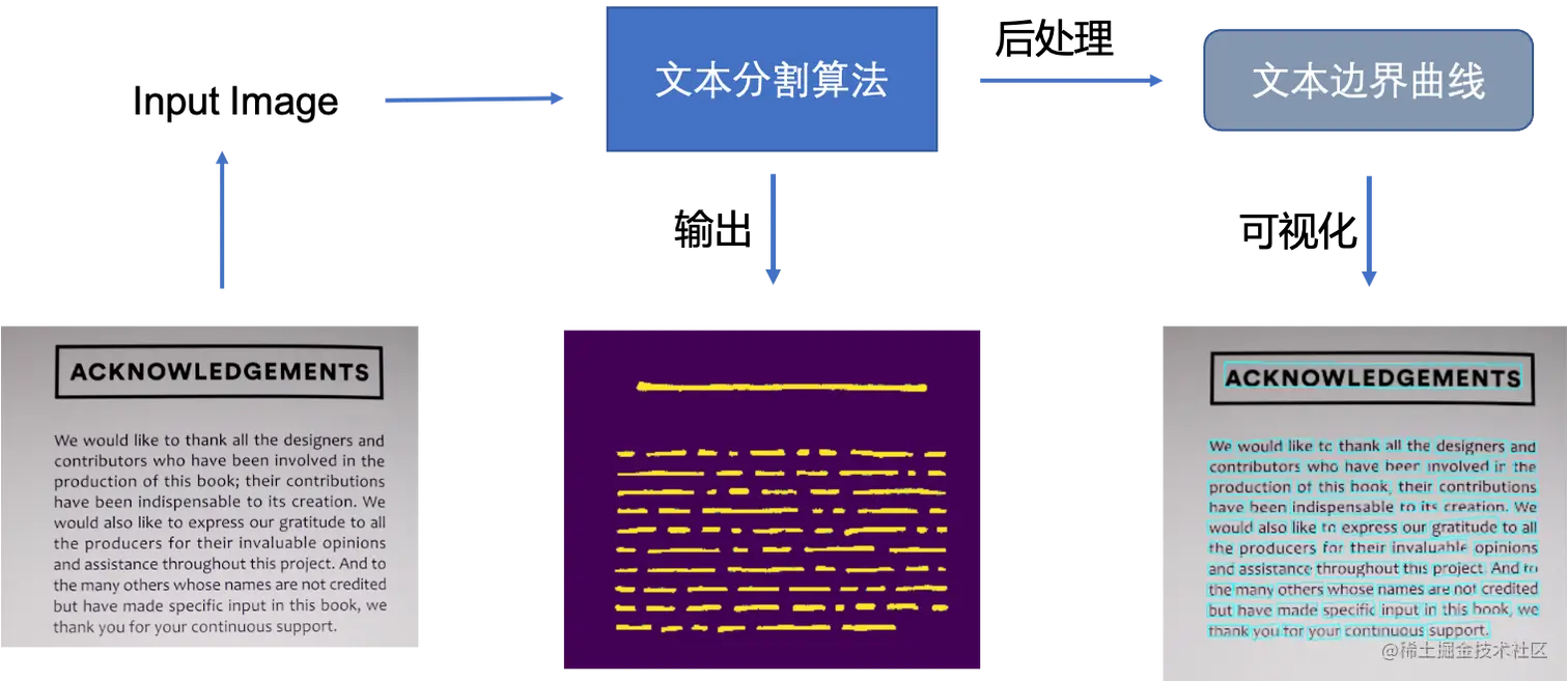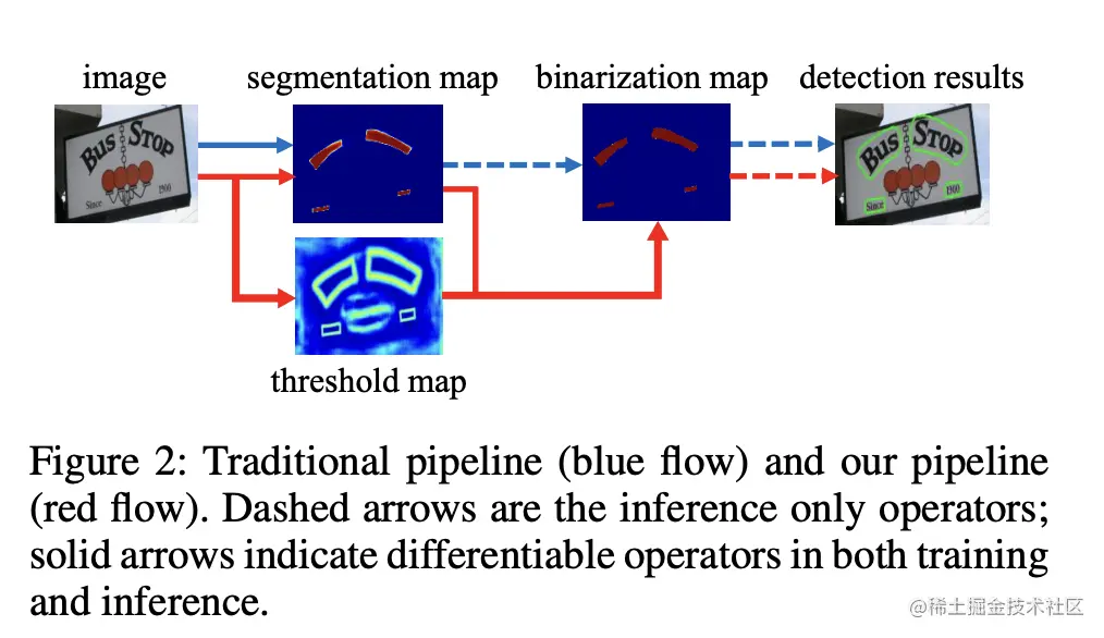 基于分割的普通文本检测算法其流程如上图中的蓝色箭头所示,此类方法得到分割结果之后采用一个固定的阈值得到二值化的分割图,之后采用诸如像素聚类的启发式算法得到文本区域。