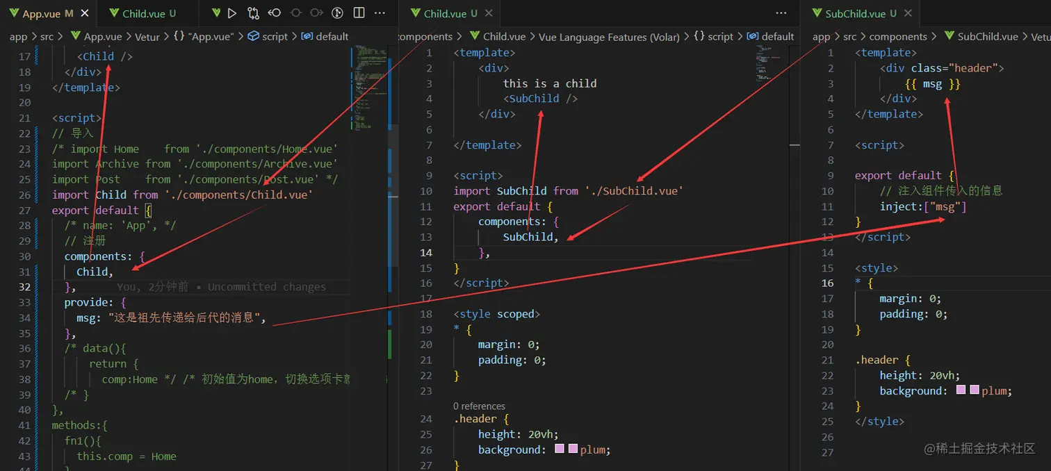 - 在后代组件中inject:["msg"]注入组件内容,即可在后代组件中调用