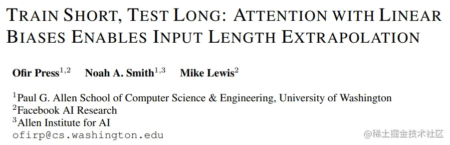 ALiBi(Attention with Linear Biases)是一种长上下文位置嵌入方案,通过根据距离对 qk 分数进行线性偏置,来支持对更长的长度进行外推。BLOOM 用了 ALiBi,Galactica 也尝试过,但没有采用。