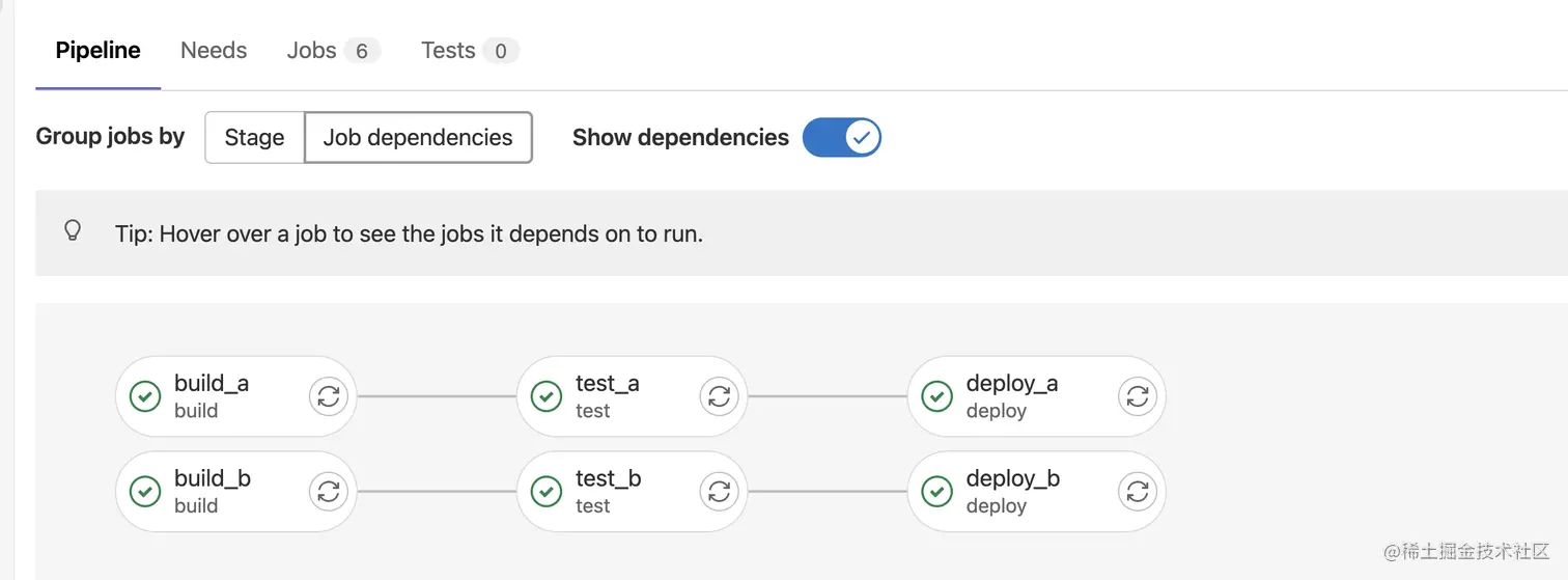 如果效率对您很重要,并且您希望一切都尽可能快地运行,则可以使用有向无环图(DAG)。 使用 needs关键字 定义作业之间的依赖关系。当系统知道您的作业之间的关系时,它可以尽可能快地运行所有内容,甚至在可能的情况下跳到后续阶段。