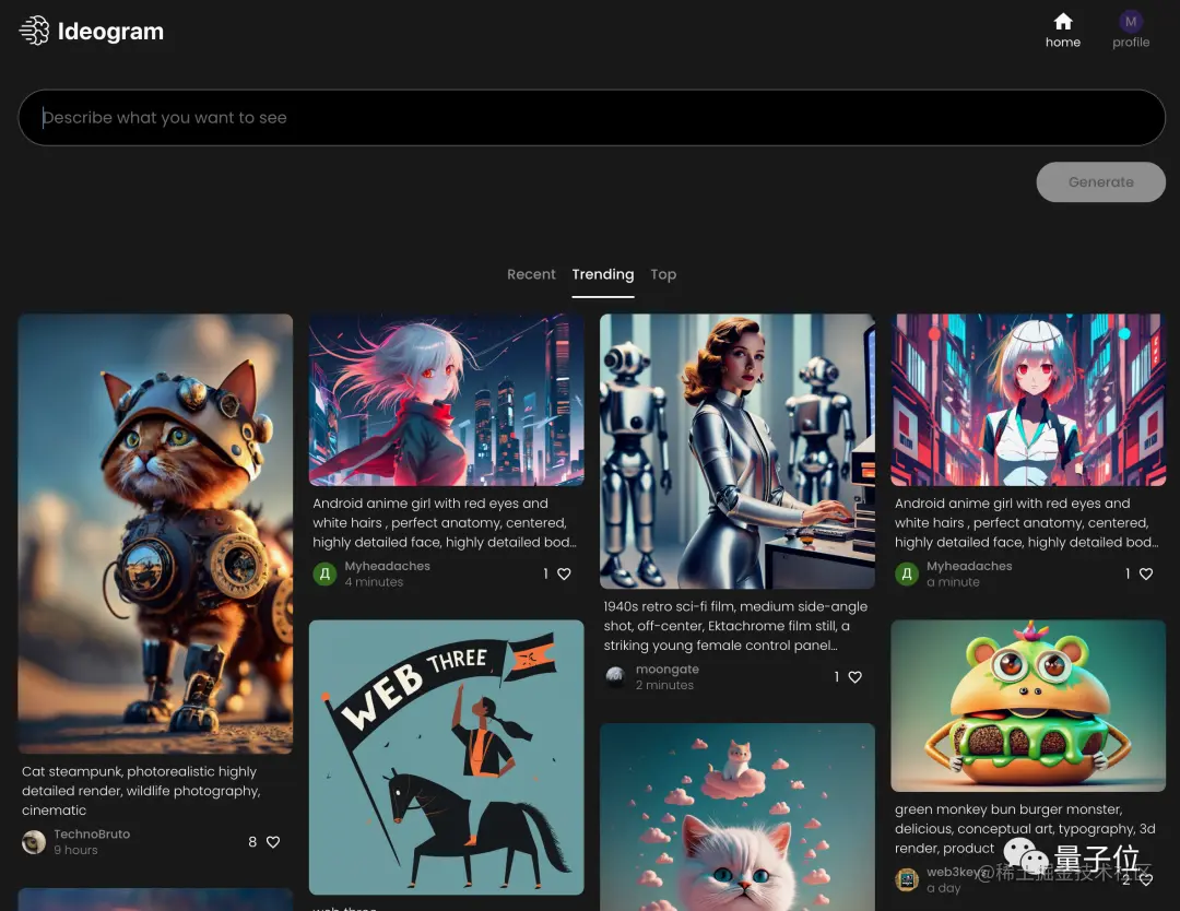 不仅做图像生成,将来还要做视频生成。 无论Imagen还是Imagen Video,谷歌出于安全、伦理等方面考虑都未曾放出试玩、API或开源代码。研究成果无法转化为应用,是近年来不少从谷歌离职创业者遇到的共同问题。如大模型那边的Transformer八位作者中,Cohere创始人Aidan Gomez就曾表示离开的原因是 “我在谷歌没有看到大模型发挥它真正的力量” 。Ashish Vaswani与Niki Parmar离开谷歌创办Adept AI与Essential AI的原因也是 “谷歌希望用Transformer优化现有产品,而我们希望创造新产品” 。后来这些研究者所担心的事也确确实实发生了:尽管2021年5月(比ChatGPT训练数据截止日期还早)谷歌就已经开发出了LaMDA对话大模型与聊天机器人,但在推出产品方面有太多顾虑,最终18个月后被隔壁ChatGPT一手直接面对公众开放抢尽了风头。……吸取了这些教训,新成立的Ideogram AI也拿出一副尽量开放、先把用户吸引进来玩的架势。最初宣布了1000人测试名额,但没一会就满了。