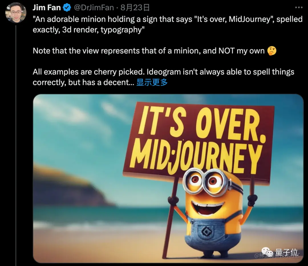 AI绘画王座上的MidJourney,终于迎来强劲对手。最新挑战者Ideogram横空出世,开局就靠免费注册吸引众多目光。最瞩目的特性:在图中精准生成文字,英伟达科学家范麟熙直接毫不客气地用它画了一个 “It’s over, Midjourney” 。