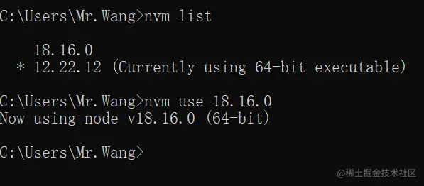 若已经成功安装了指定版本的NodeJS,只需要在命令行窗口执行npm use ..命令,切换对应版本的NodeJS即可 切换成功会出现 Now using node v***