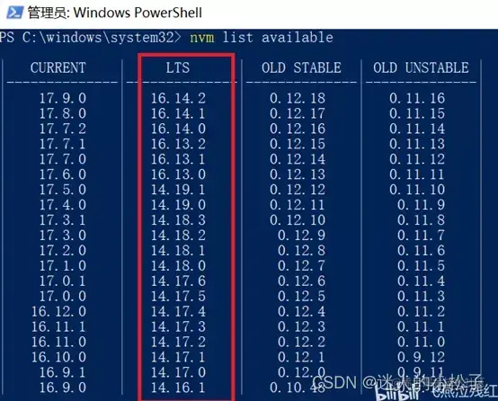 (1)使用nvm list available命令查看可安装的NodeJS版本,建议选择LTS版本(Long Term Support,长期支持版本)