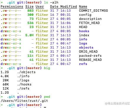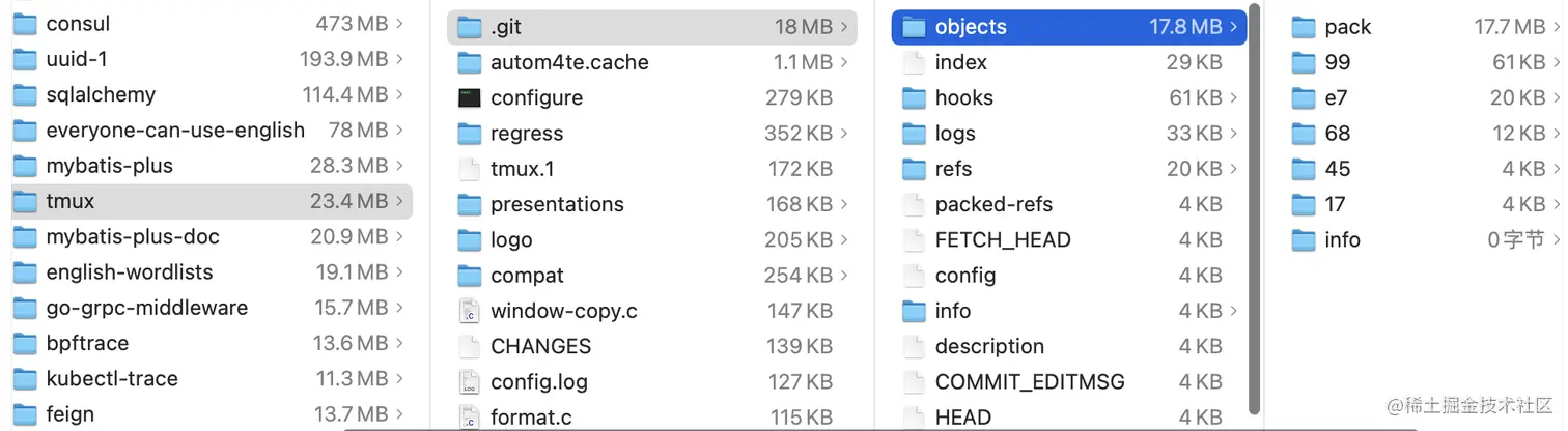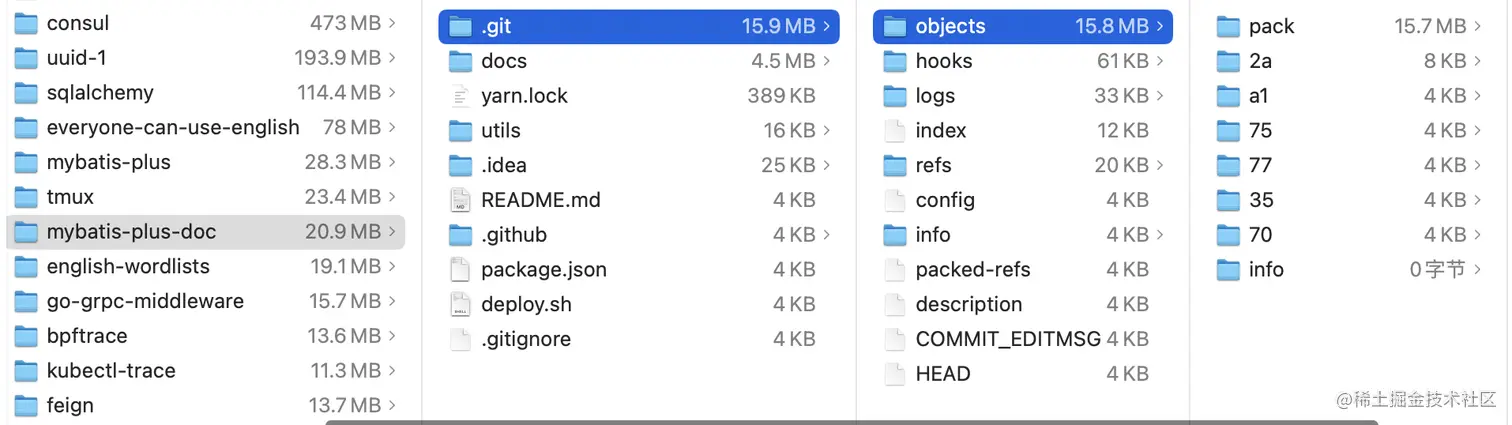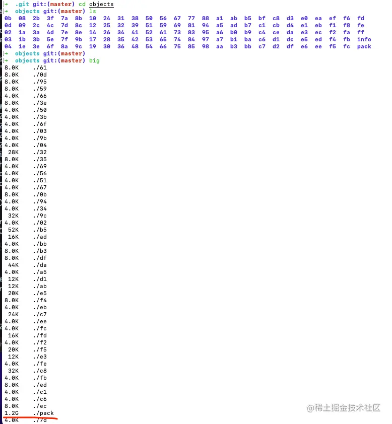 可见在.git目录下,objects文件夹占用了绝大多数空间