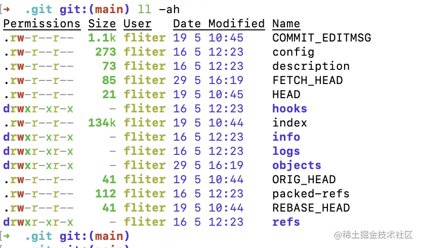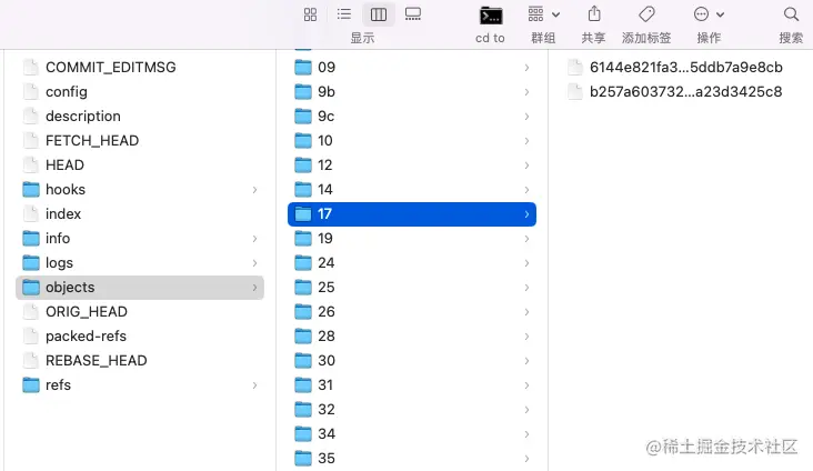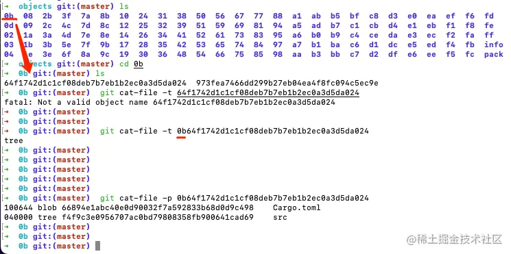 在 .git/objects 目录下,每个对象都被存储为一个以 40 个字符的 SHA-1 值命名的文件,前两个字符作为目录名,后 38 个字符作为文件名。例如,一个 blob 对象的 SHA-1 值为 c4a7f3c8d5c9aeb7c6f6a7e1c4b8c7c2c8d5fc1f,那么它对应的对象文件就被存储在 .git/objects/c4/a7f3c8d5c9aeb7c6f6a7e1c4b8c7c2c8d5fc1f 中。
