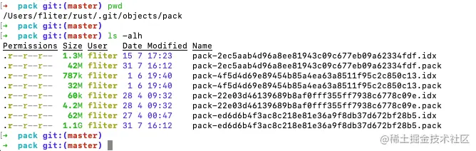 .git/objects/pack 目录中的文件都是经过压缩的 Git 对象文件,这些文件的文件名通常以 .pack 结尾。当 Git 需要访问某个 Git 对象时,它会先查找 .git/objects 目录下是否存在对应的 Git 对象文件,如果不存在,Git 会查找 .git/objects/pack 目录下的 .idx 文件,根据索引信息找到对应的 .pack 文件,并从中解压出需要的 Git 对象。