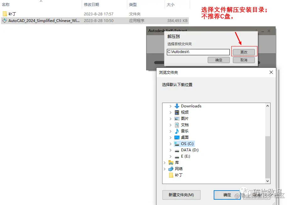 双击AutoCAD_2024_Simplified_Chinese_Win_64bit_dlm_001_002.sfx文件(红色方框),弹出解压文件对话框。选择好安装文件后会进行文件解压