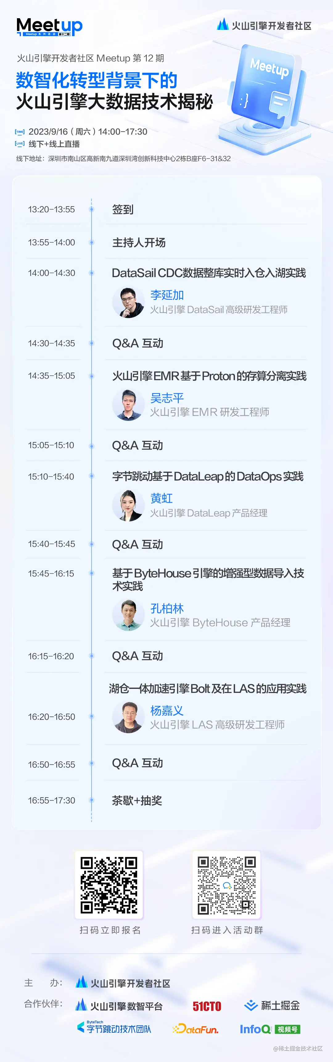 9 月 16 日,火山引擎开发者社区 Meetup 第 12 期暨超话数据专场邀请到了火山引擎数据平台的 5 位专家,将从数据分析、数据治理、研发提效等角度,为大家带来干货分享,帮你全面了解数智化转型背景下的火山引擎数据飞轮模式在数据资产建设上的技术与实践。现场更有火山引擎定制双肩包、抱枕、水杯、帆布袋等超多精美礼品,线下参与才可领取哦,期待与大家现场面基!