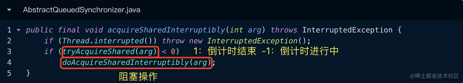 从上面的演示示例中,我们已经看到,通过在主线程中调用countDownLatch.await()方法,使得主线程进入阻塞状态,那么其内部是如何实现的呢?我们把视角转移到await()方法中。在其方法内,只有一行代码,即,调用sync的acquireSharedInterruptibly(1)方法,此处需要额外说明一下,这个sync其实是继承了AQS类的实例对象,所以,它同时也具备了AQS的所有功能,那么从这里大家也能得出一个结论,就是CountDownLatch所具备的能力其实底层都是通过AQS实现的。代码如下所示: