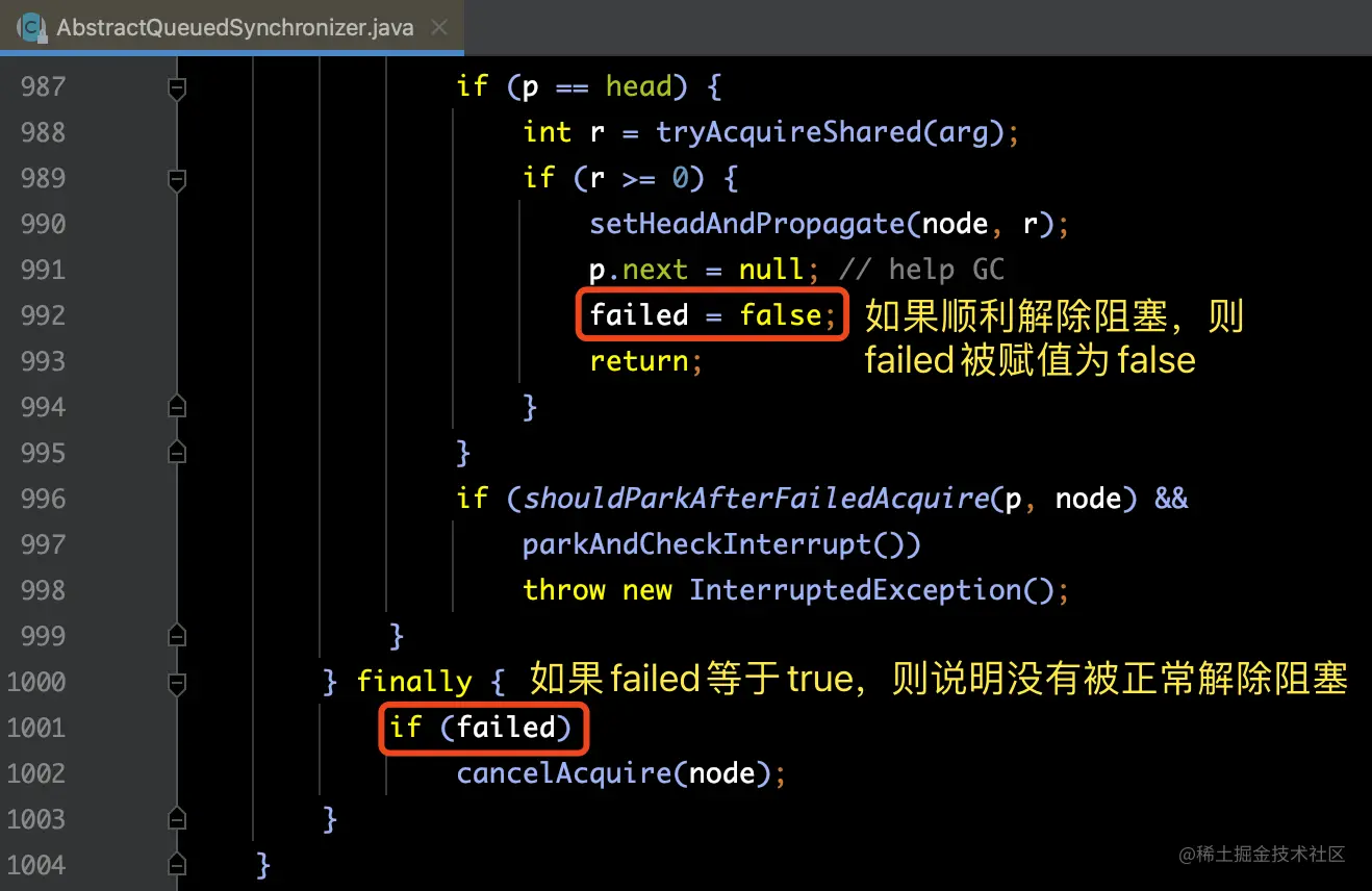如果顺利的解除阻塞的话,failed变量会被赋值为false,那么在finally中的cancelAcquire(node)方法则不会被调用。反之,如果failed等于true,则说明阻塞并未按照正常的unpark方式解除阻塞,即,通过异常的方式解除的阻塞,那么我们就需要执行cancelAcquire(node)方法进行失败后的收尾工作了,具体代码如下所示: