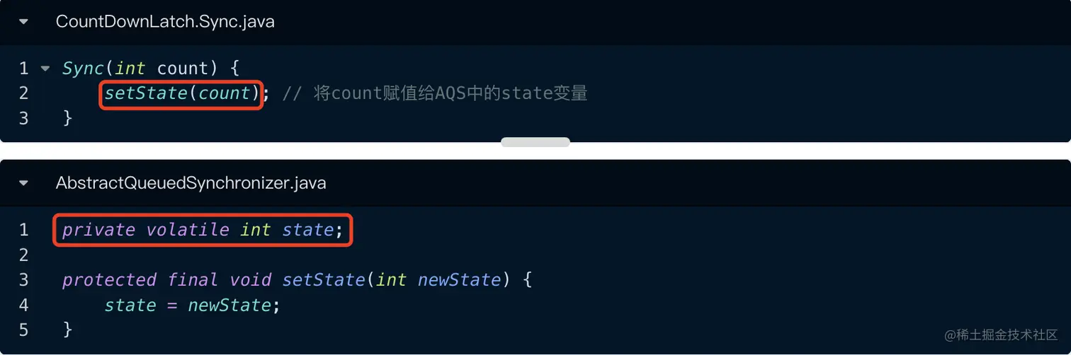 如果设置的count值是合法值,那么则通过setState(count)方法,将count赋值给AQS中的state变量。那么这个state值,就可以用来做倒计时的计数用了,如果为0,则表示倒计时结束,否则,则依然无法解除主线程的阻塞状态。