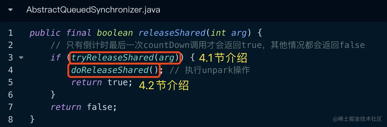 当“倒计时”结束,即:执行了足够次数的countDown()方法(此步骤会在“四、countDown()方法源码解析”章节进行介绍);则会触发解除阻塞的操作了,即:下图红框内的代码。