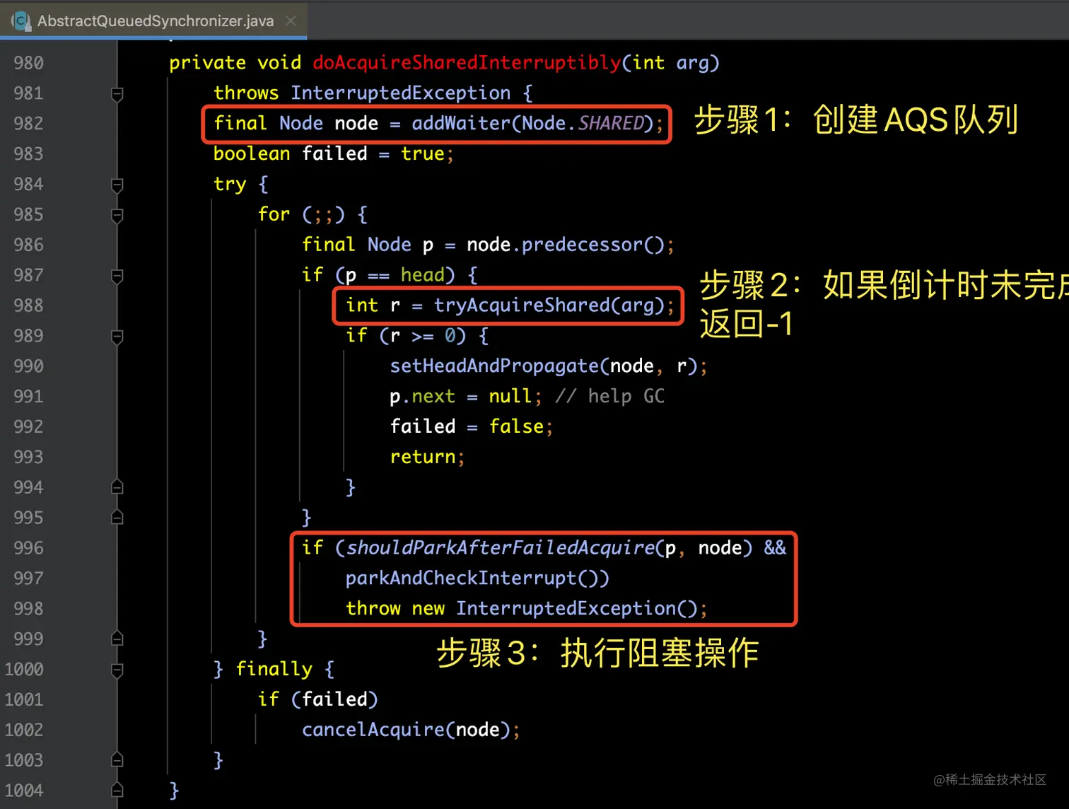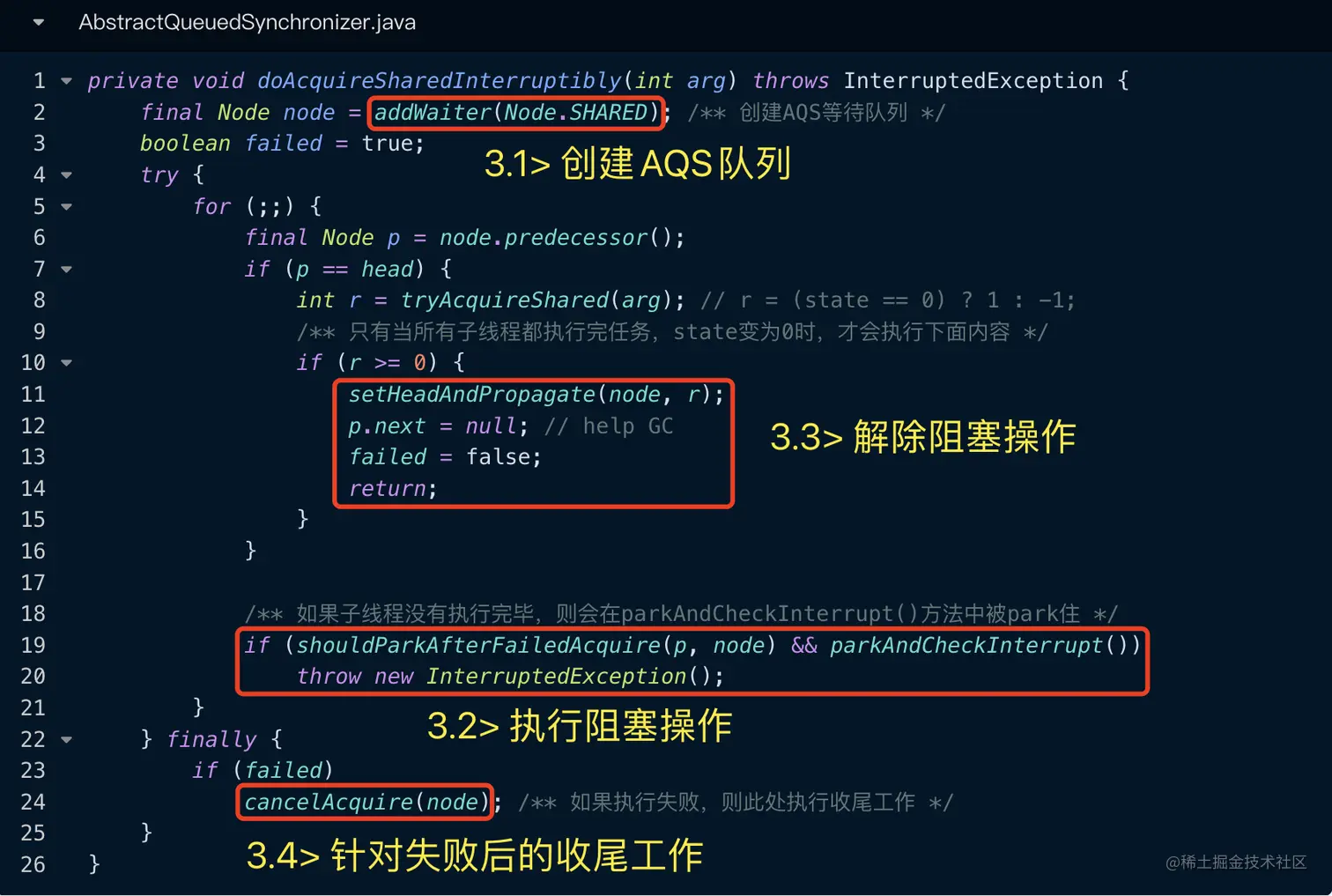 如果倒计时没有结束,则会执行doAcquireSharedInterruptibly(-1)方法,在该方法内部主要由四部分逻辑组成,下面我们也会依次针对这些部分进行详细解析:
