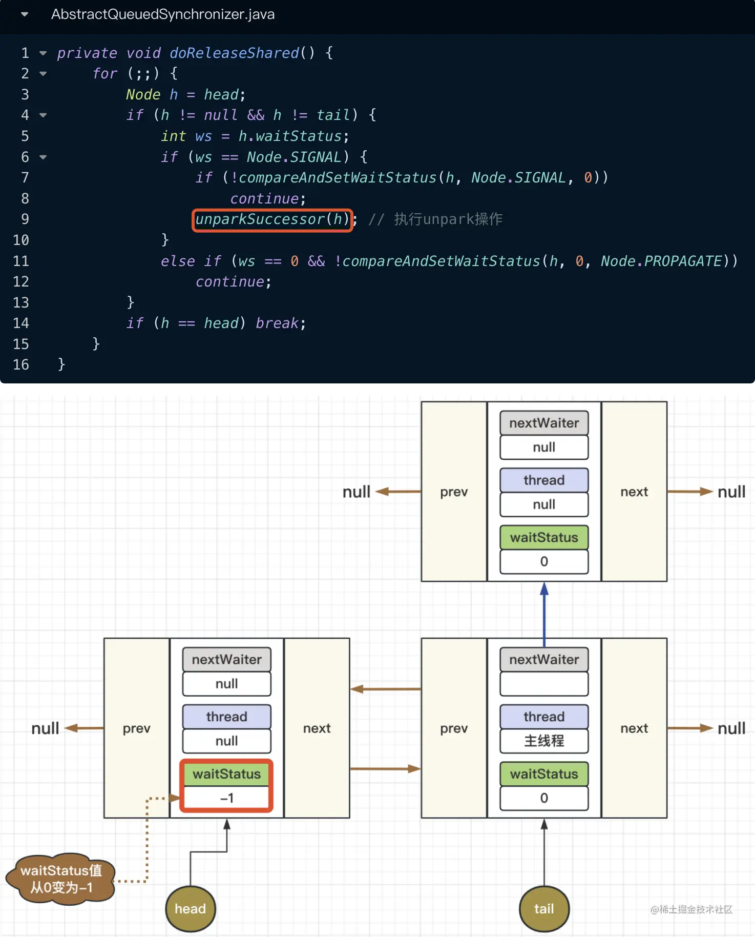 在doReleaseShared()方法中,我们要开始真正的执行解除阻塞的操作了。方法首先开启了无限for循环,然后进行了一系列的判断,对于当前AQS队列的情况,上面已经通过图的方式表现了,为了便于大家回忆,我又把它粘贴到了doReleaseShared()方法源码的下面,此时h不等于null,并且h不等于tail,并且h的waitStatus等于-1(Node.SIGNAL),所以是可以顺利执行unparkSuccessor(h)这行代码的;当解除阻塞后,此时head指针向后移动一个节点,那么在第二次循环时,由于无法满足h!=tail,则执行第14行——if(h==head) break;跳出无限循环,结束本方法了。具体代码如下所示: