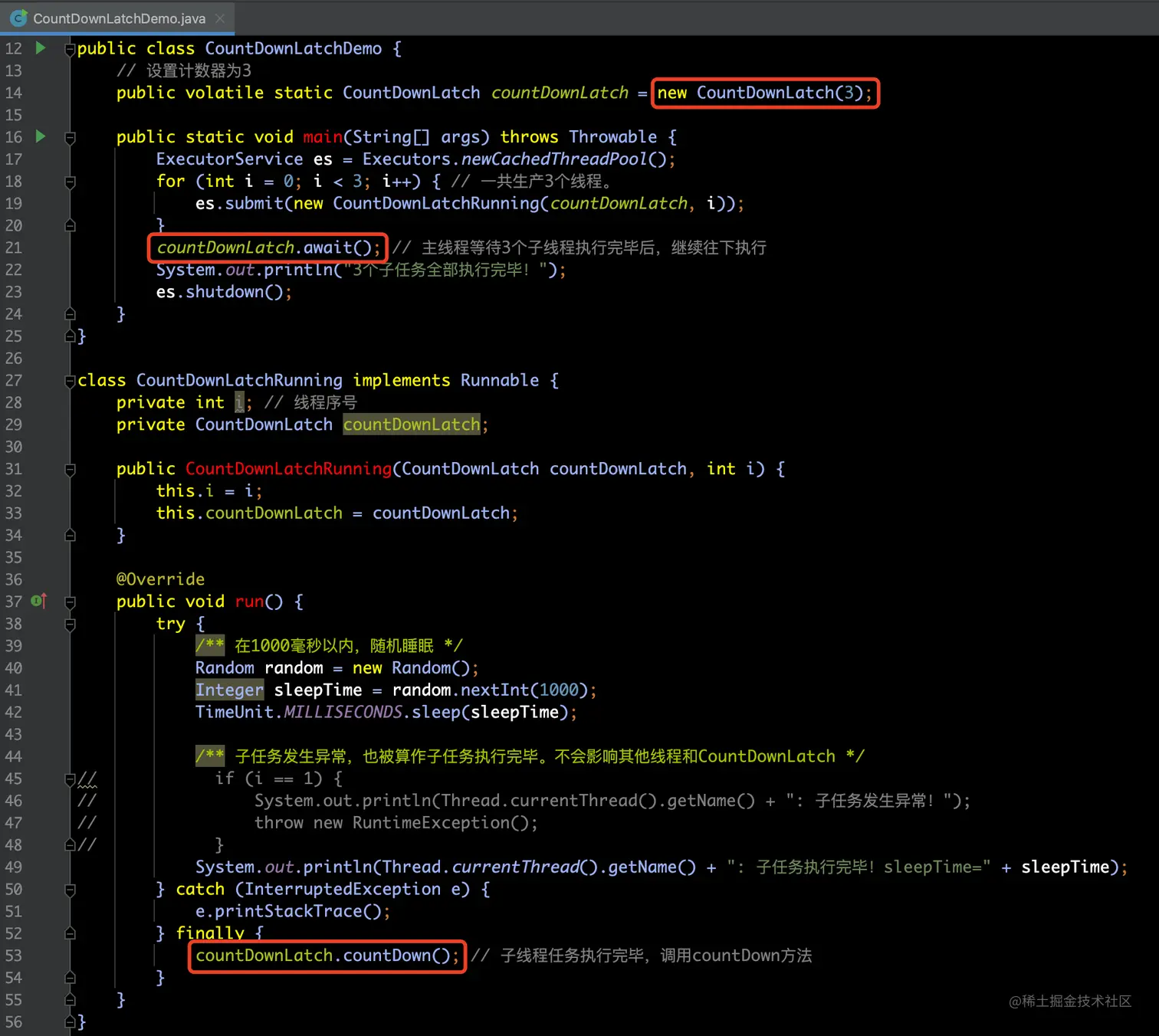 【最后】当子线程执行完某个任务之后,调用countDown()方法执行倒计时减1操作;当倒计时为0的时候,主线程解除阻塞,继续执行await()方法下面的代码逻辑;