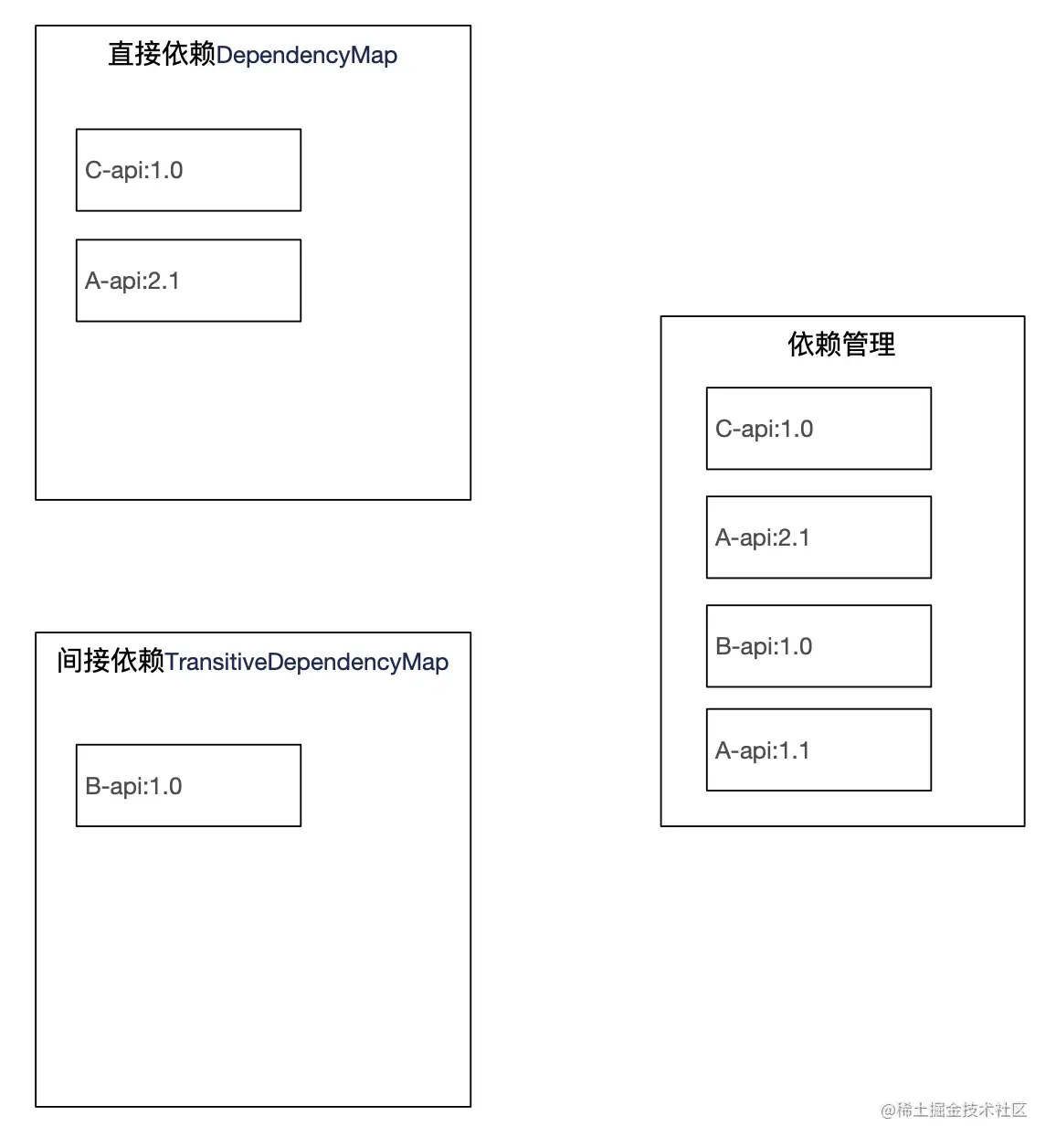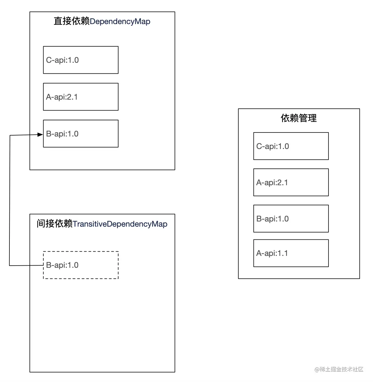 - 所有间接依赖的 TransitiveDependencyMap , 对于项目的 DependencyMap 里面没有的 key ,依次放入项目的 DependencyMap 。