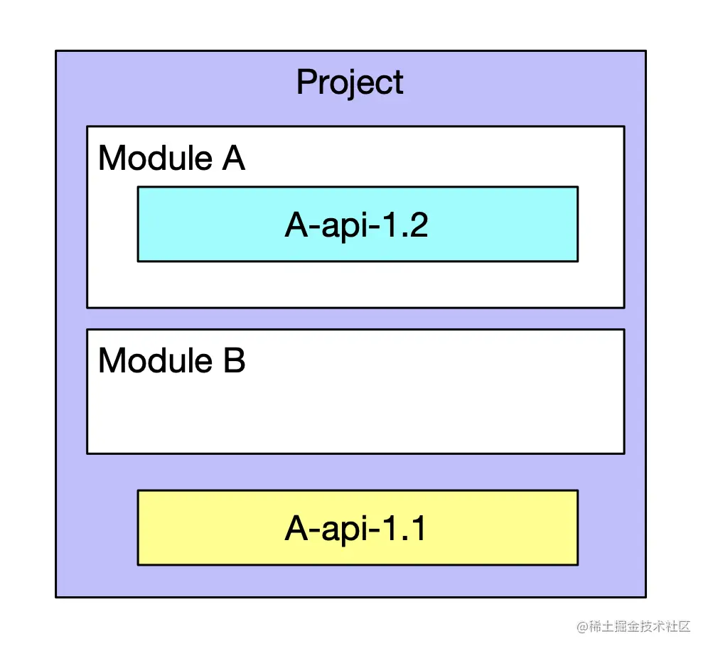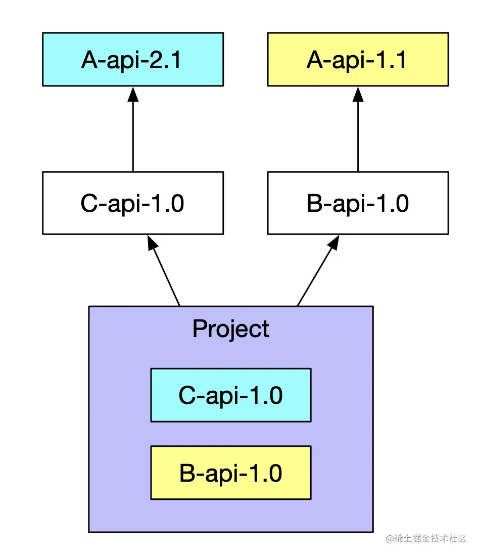 Maven 依赖遵循最短路径优先原则,当项目直接依赖一个 C-api-1.0 和 A-api-2.1 包,并且 C-api-1.0 有如下间接依赖关系: C-api-1.0 —> B-api-1.0 —> A-api-1.1 这时候项目里包含了 A-api 的 1.1 和 2.1 两个版本,由于存在最短路径原则明显 Project —> A-api-2.1 短于 Project —> C-api-1.0 —> B-api-1.0 —> A-api-1.1 故 Project 项目里会使用 A-api-2.1